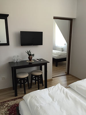 Az apartman-t 2 szoba alkotja. Az egyik szobába található egy franciaágy, a másikban pedig a két különálló ágy.